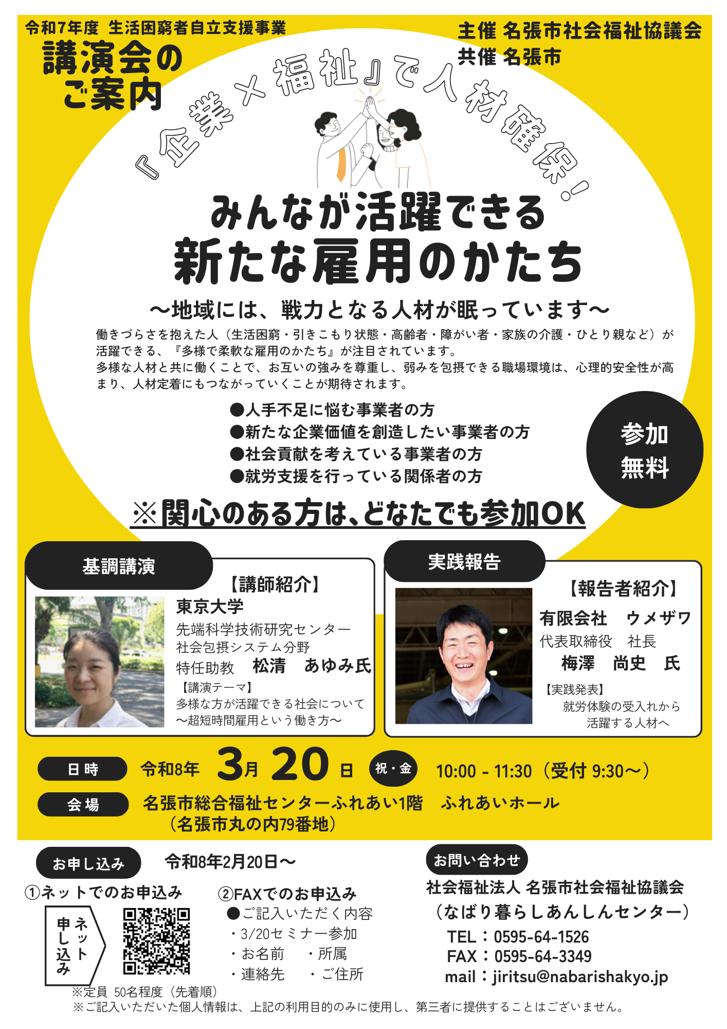 - 令和8年3月20日(金・祝)10:00~11:30 名張市総合福祉センター1階ふれあいホールにて、講演会「みんなが活躍できる新たな雇用のかたち」を開催します。 【お申し込み】 令和8年2月20日~ ※関心のある方は、どなたでも参加できます。詳細は、下記チラシをご覧ください。